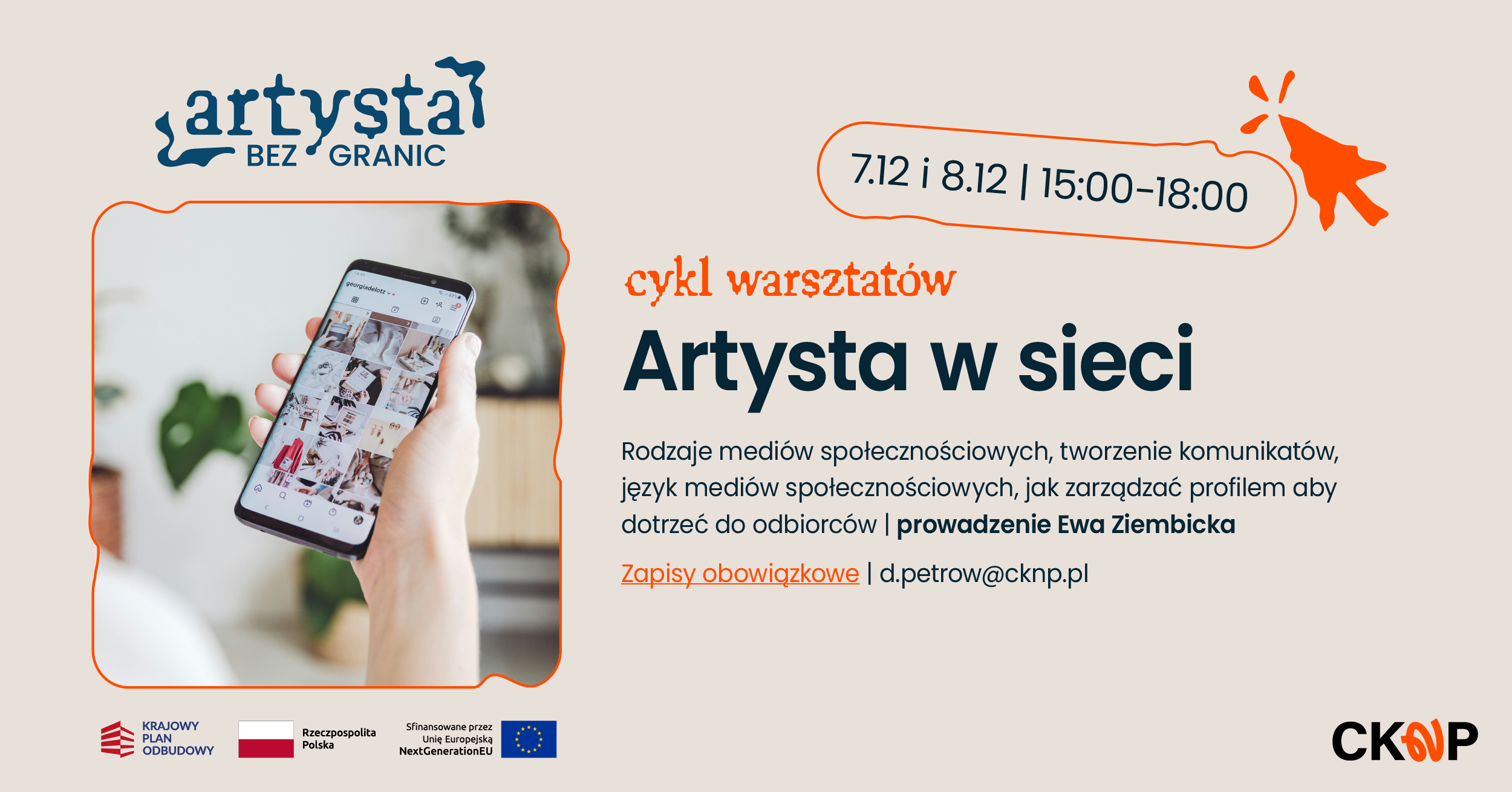 O wydarzeniu: Warsztaty odbywają się w ramach projektu „Artysta bez granic”. Więcej informacji o projekcie znajdziesz na stronie: cknp.pl/o-centrum/projekty/.