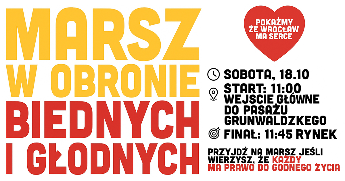 Marsz w obronie biednych i głodnych to głos dla tych, których nikt nie słucha. Dołącz w sobotę o 11:00 pod Pasażem Grunwaldzkim. Razem pokażmy, że nikt w Polsce nie powinien głodować! Coraz więcej osób nie stać na jedzenie, rachunki i leki. Pomoc państwa trafia za późno lub wcale. Marsz jest potrzebny, by przypomnieć, że ubóstwo to nie wina ludzi, to wina obojętności. Zapraszamy wszystkich: biednych i bogatych, młodych i starszych, rodziny, studentów, emerytów, organizacje społeczne i ludzi dobrej woli. Ten marsz jest dla każdego, komu zależy na innych.