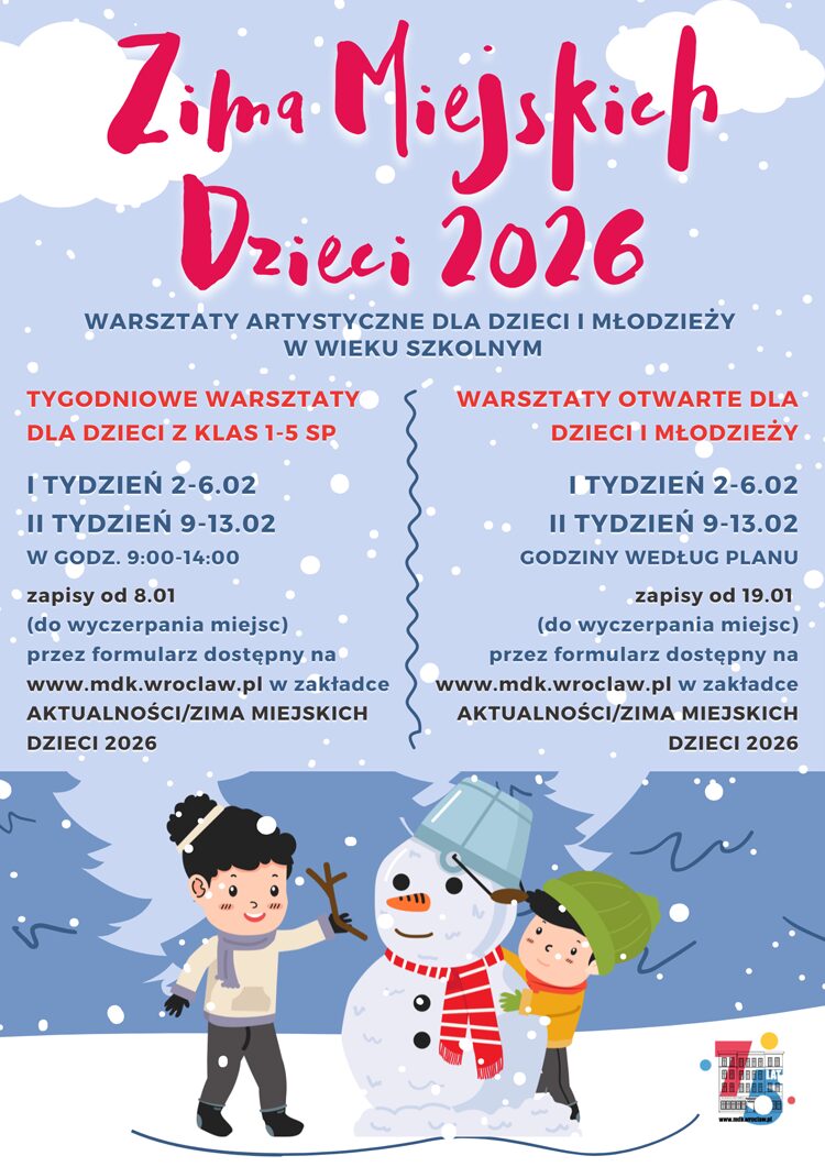 Zapisy: rozpoczną się 8 stycznia 2026 przez formularz elektroniczny dostępny na stronie www.mdk.wroclaw.pl w zakładce AKTUALNOŚCI → Zima Miejskich Dzieci 2026