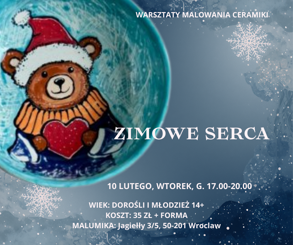Pod okiem lokalnej artystki krok po kroku stworzysz własne ceramiczne kompozycje inspirowane zimowymi sercami – symbolem bliskości, czułości i spokoju w chłodne dni. Motywy serc, delikatne zimowe wzory i subtelna paleta barw pozwolą nadać pracom osobisty, emocjonalny charakter.