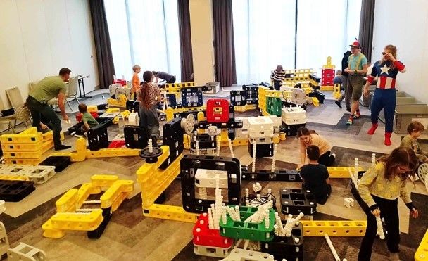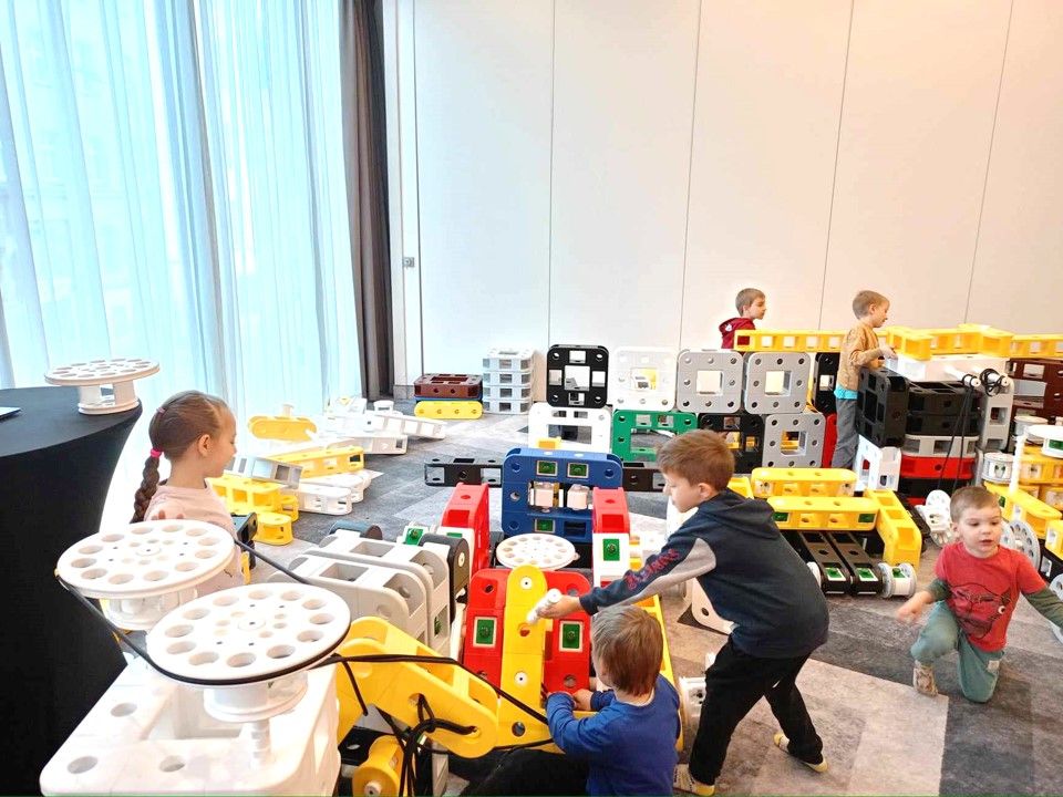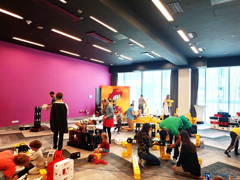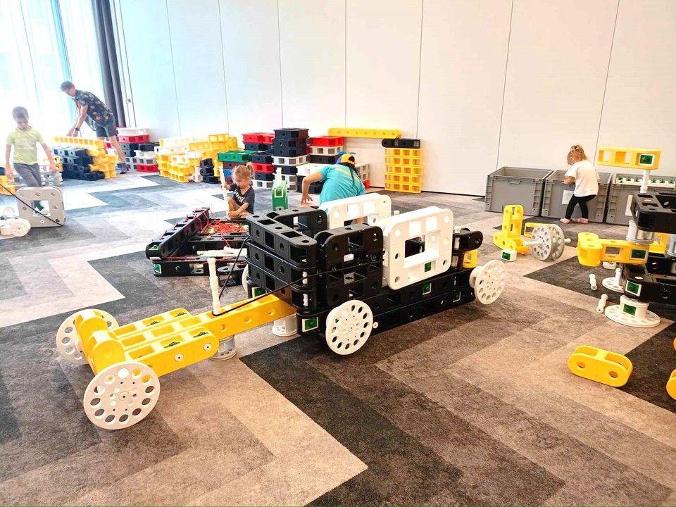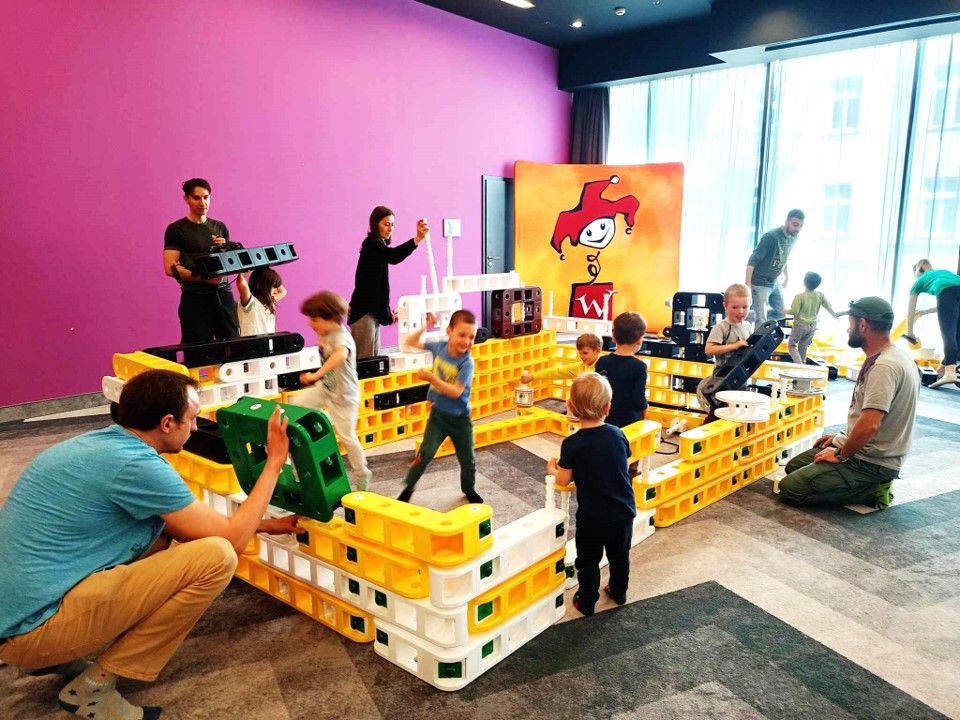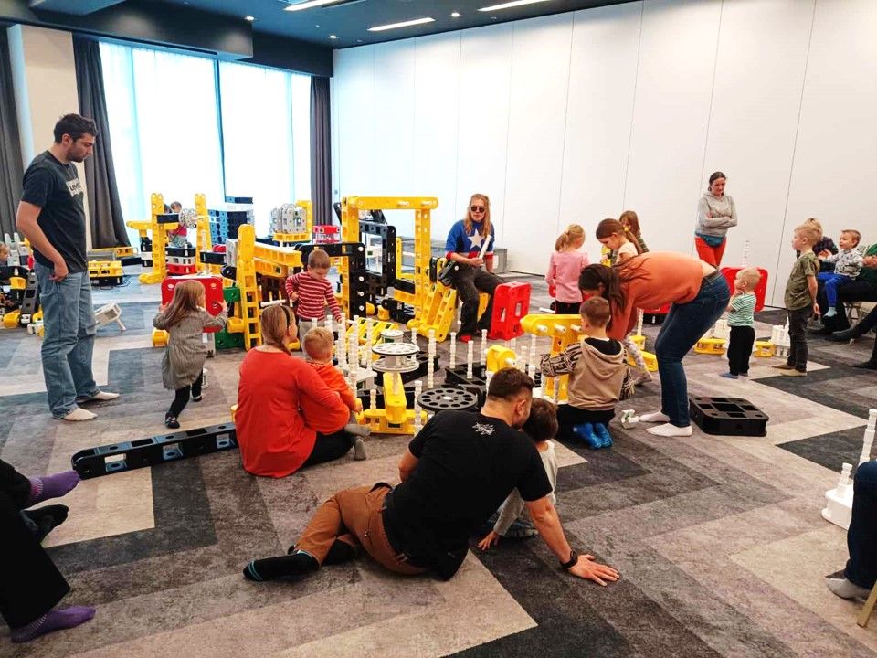 Do zabawy wykorzystujemy gigantyczne klocki inspirowane popularną serią „Technik”. Ich innowacyjna, 15-krotnie większa skala w porównaniu do standardowych zabawek pozwala na tworzenie naprawdę spektakularnych konstrukcji.