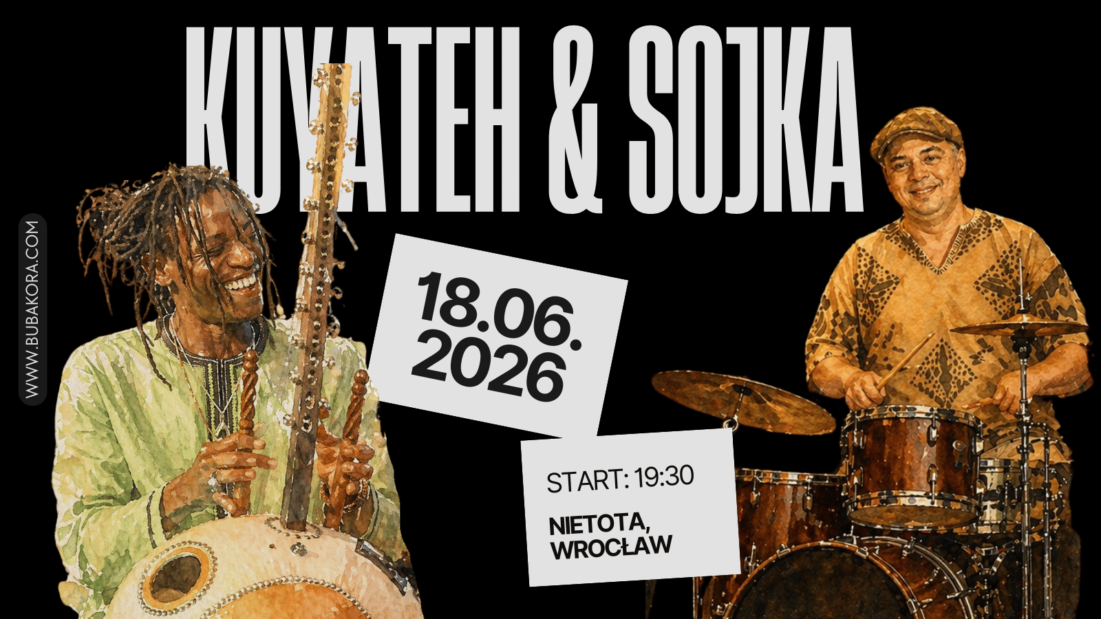 Buba Badjie Kuyateh, wirtuoz gry na korze – zachodnioafrykańskiej harfie będącej symbolem wielowiekowej tradycji – oraz Kuba Sojka, wybitny perkusista, zabiorą publiczność w pełną energii i emocji muzyczną podróż.