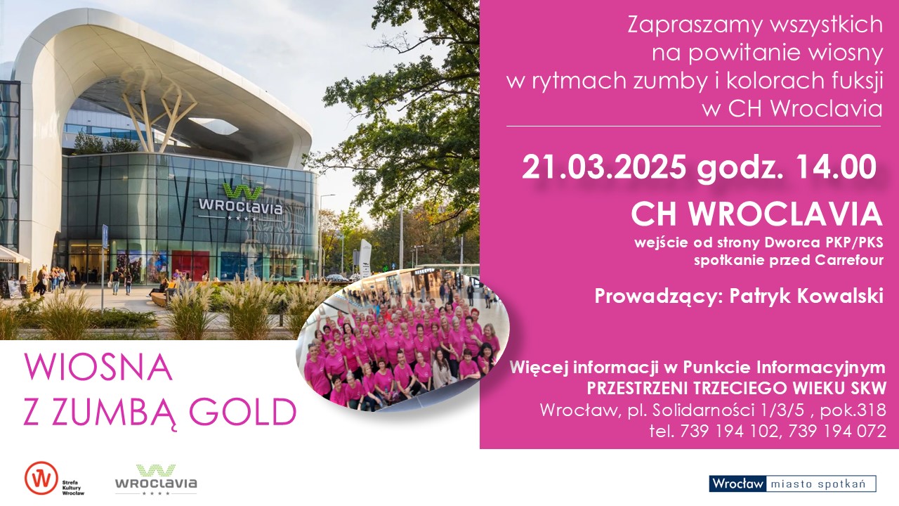 Przestrzeń Trzeciego Wieku SKW i CH Wroclavia zapraszają na wyjątkowe wydarzenie pełne tańca, ruchu i radości! 21 marca 2025 r. w CH Wroclavia wspólnie przywitamy wiosnę w rytmach Zumba Gold – dynamicznego, ale łagodniejszego tańca idealnego dla każdego, niezależnie od wieku czy kondycji.