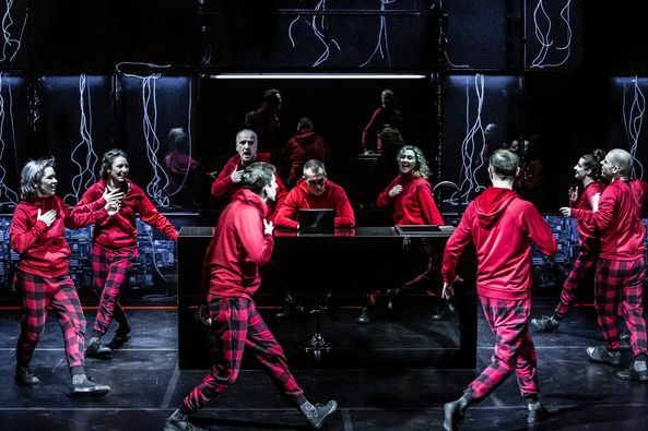 „Melodie i polifonie języka znajdują odzwierciedlenie w choreografii – ośmioosobowy zespół, ubrany w identyczne czerwone kostiumy, tworzy ruchliwy, zbiorowy organizm, rozlewający się w przestrzeni, to znów niknący" (Jolanta Kowalska, miesięcznik Teatr).