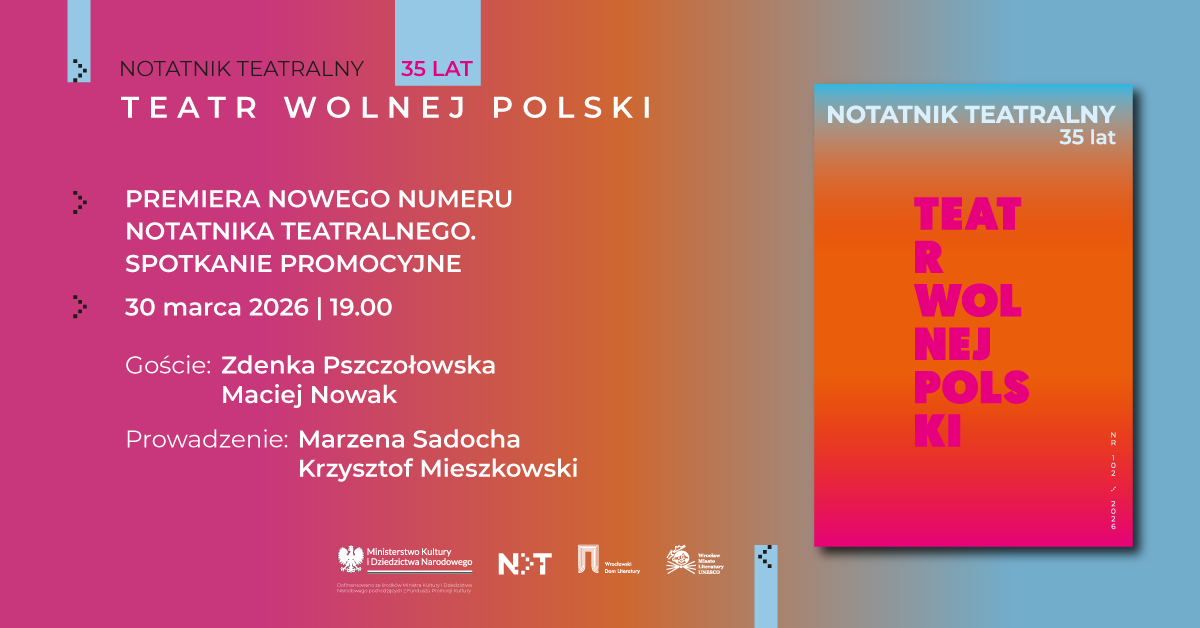 Zapraszamy na spotkanie promocyjne numeru 102/2026 „Notatnika Teatralnego”. Rozmowę ze Zdenką Pszczołowską i Maciejem Nowakiem poprowadzą Marzena Sadocha i Krzysztof Mieszkowski.