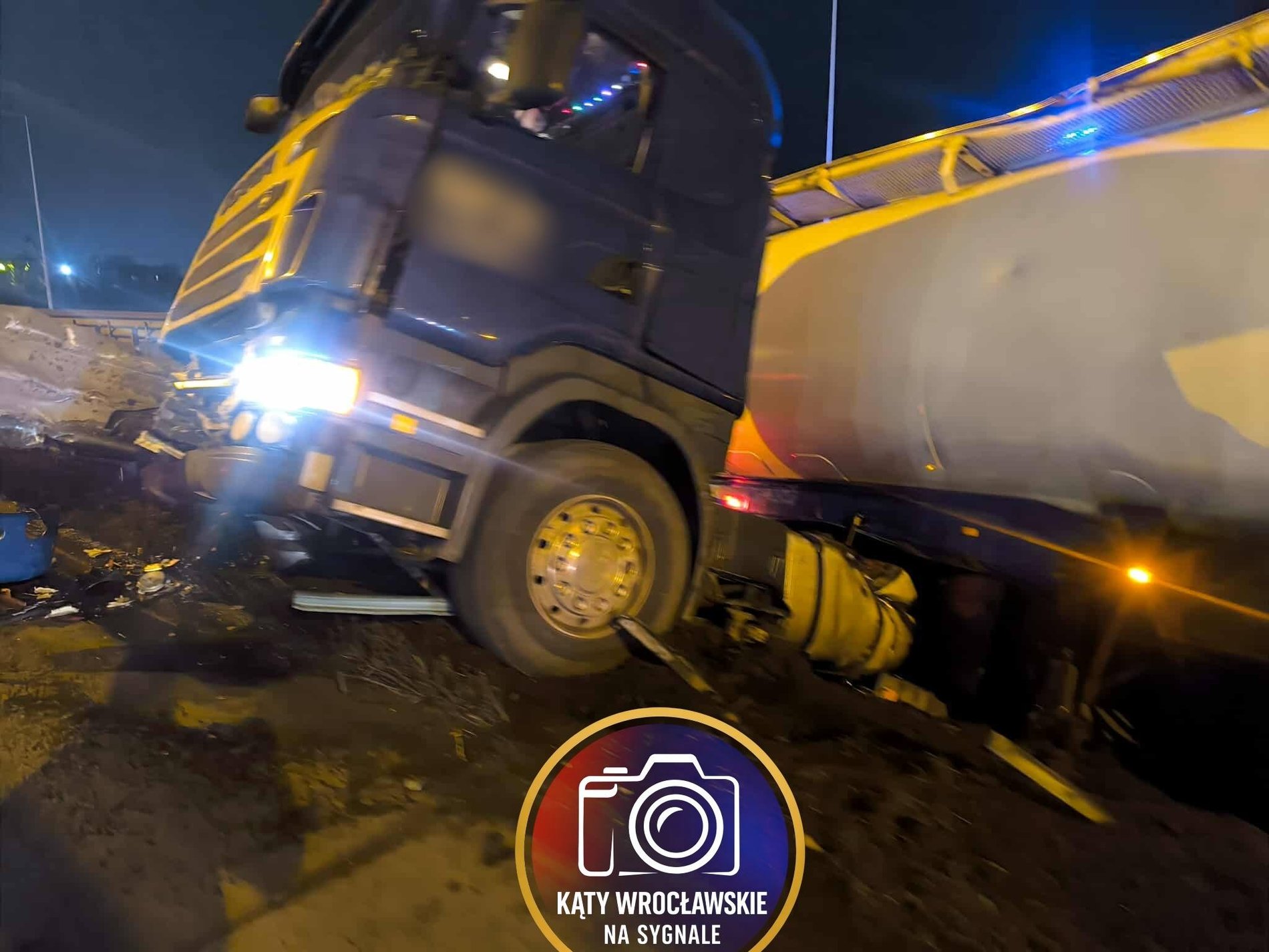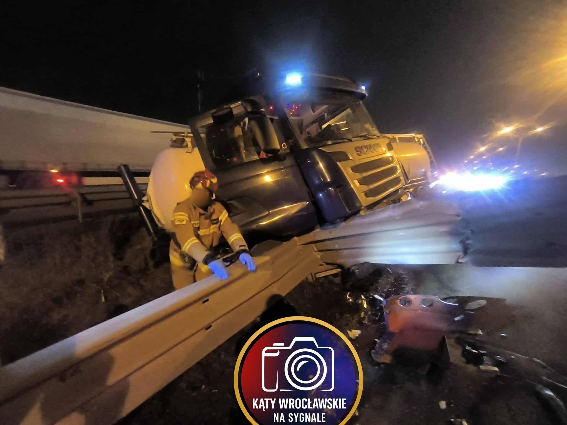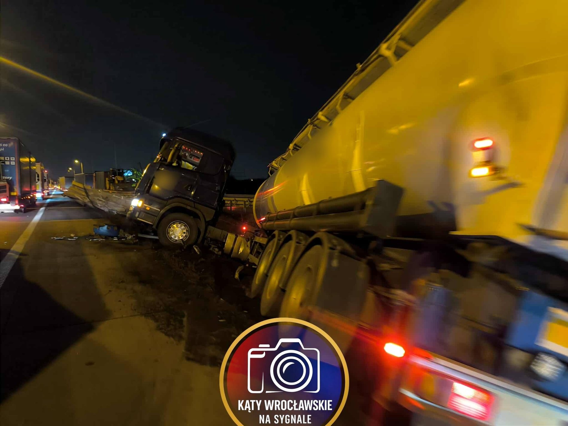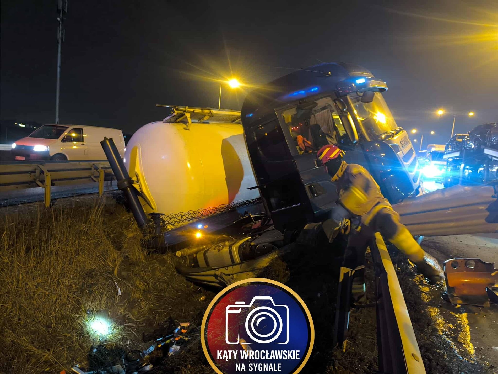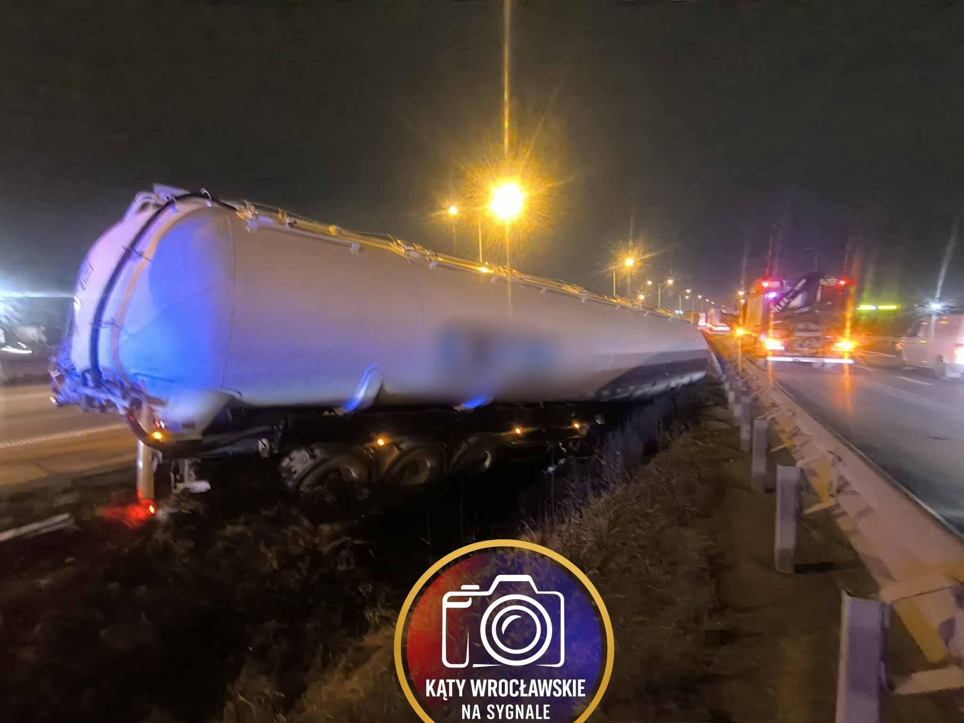Do zdarzenia doszło między węzłami Wrocław Południe i Pietrzykowice w stronę Zgorzelca. Samochód ciężarowy typu cysterna przewrócił się po tym, jak uderzył w bariery energochłonne i wypadł z drogi.